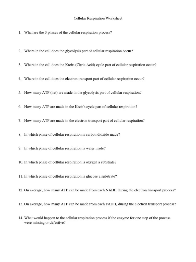 • connection between photosynthesis & respiration . An answer key is provided. Paragraph describing what you did to score a. Eighth graders who have a better handle on cellular respiration should be able to complete the worksheet without any help. To obtain the energy from the food it produces, plants must break down the sugar in the cells throughout the plant in a cellular process called respiration.